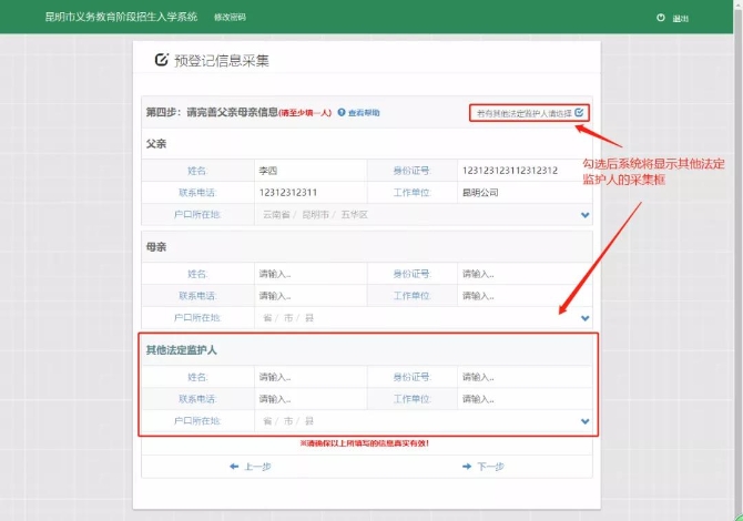 ,填写其他法定监护人信息。如下图所示: