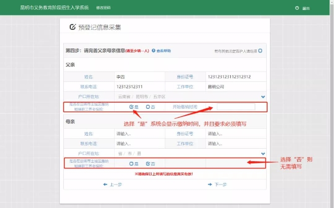 根据系统要求填写家长信息,要求至少填写一人。如下图所示: