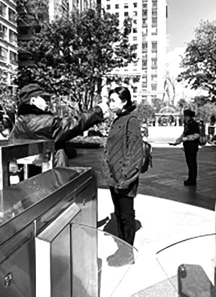 俊发物业保安为进出小区的人员测量体温