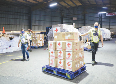 3月21日,搭载中国政府援助菲律宾医疗物资的包机抵达马尼拉国际机场。图为当地机场工作人员正在搬运物资。