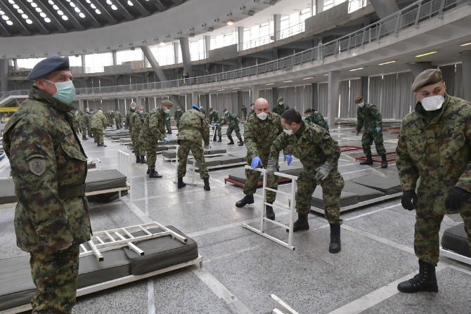 3月24日,在塞尔维亚首都贝尔格莱德,塞尔维亚士兵和工作人员为中国专家建议建立的方舱医院组装病床。新华社发(塞尔维亚国防部提供)