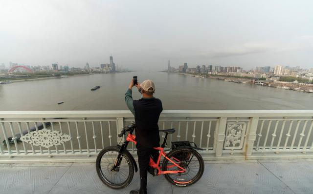 3月25日,在武汉长江大桥,一名骑行的市民停下来拍照。新华社记者 费茂华 摄
