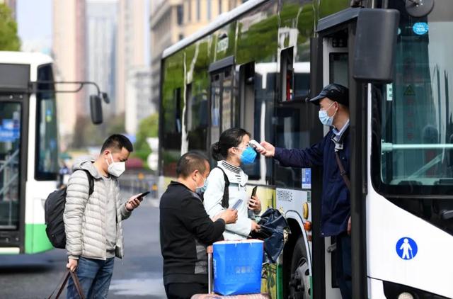 3月25日,武汉市汉口火车站公交车站,乘客正在通过扫码、量体温乘车。3月25日起,武汉恢复117条公交线路的运营。经济日报记者高兴贵摄