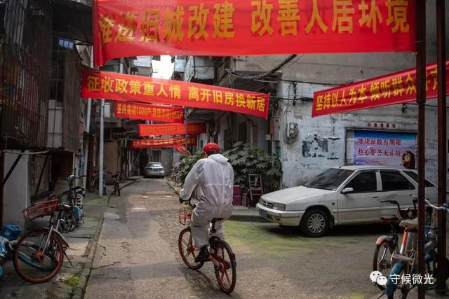 3月24日,武汉市大董社区,一名下沉干部骑着共享单车穿行在社区里。中青报·中青网记者 李隽辉/摄