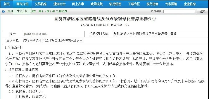 昆明信息港讯(昆明日报 记者孙莹)3月27日,昆明市公共资源交易平台发布了《昆明高新区东区道路沿线及节点景观绿化管养招标公告》。公告显示,为提升高新区东区道路沿线及节点景观绿化管养,将总投资5445万元对该区域进行道路绿化。
