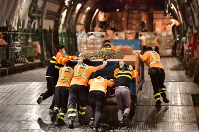 深圳机场工作人员将防疫物资推向飞机货舱。深圳机场供图