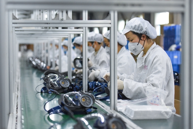 3月24日,在湖北省荆州思创科技开发有限公司生产车间,工人正加紧生产口罩、防护面具等医疗物资。(黄志刚 摄)