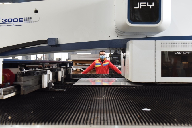 3月24日,在湖北荆州江帆建筑机械有限公司生产车间,技术人员正在操作大型机床赶制订单产品。江帆机械公司自3月12日复工复产后,260名员工全部实现返岗,公司承接新订单1.5亿元。(叶力铭 摄)