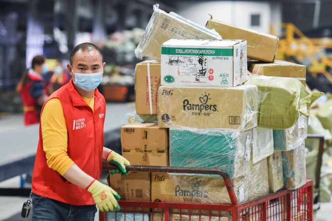 3月23日,在荆州市浩瀚物流园内,来自百世快递荆州集散中心的返岗工人正在分拨快件。目前荆州全市绝大部分乡镇已有邮政快递网点开展服务。(周玲玲 摄)