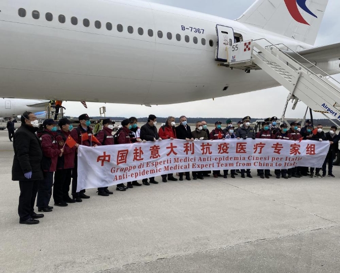 3月25日,在意大利米兰马尔奔萨机场,中国第三批赴意大利抗疫医疗专家组成员与意方人员合影。