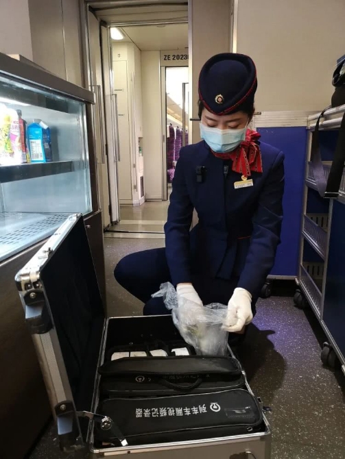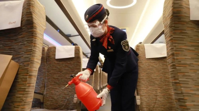 在防疫部门对列车进行消毒防疫的基础上,乘务员二次整备作业时再次进行消杀,一处不漏,加大列车深度保洁力度,确保始发列车趟趟消毒措施落实到位。