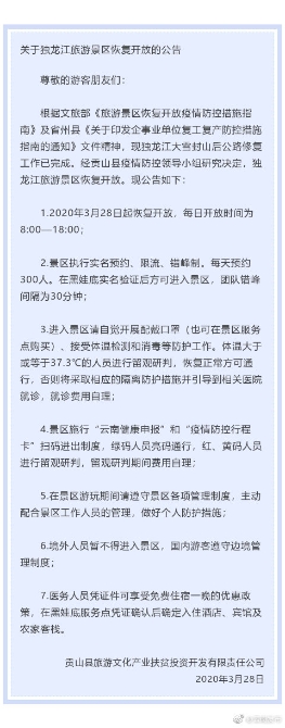 昆明信息港讯 机器人小明 【怒江独龙江景区恢复开放 每天限流300人 医务工作者可免费住宿一晚】3月28日,怒江傈僳族自治州贡山县旅游文化产业扶贫投资开发有限责任公司发布《关于独龙江旅游景区恢复开放的公告》。公告称,独龙江旅游景区于3月28日起恢复开放,景区执行实名预约、限流、错峰制,每天限流300人。医务人员凭证件,可享受免费住宿一晚的优惠政策。(怒江州委宣传部)
