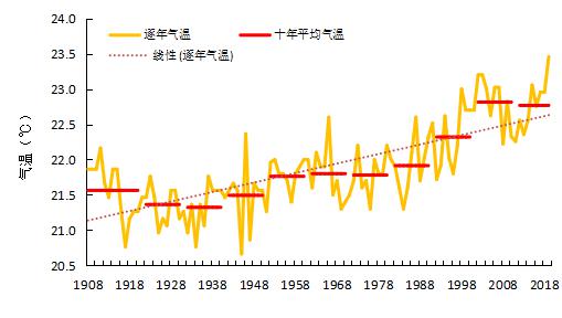 从广州1908-2019年间年平均气温变化图可见,气温随时间有上升的趋势是显而易见的,平均升温速度达到了0.14℃/10年,也就是100年上升了1.4℃。20世纪80年代以来增暖趋势最强,进入21世纪以来的19年,则是广州有气象记录以来最暖的时期,年平均气温为22.8℃。