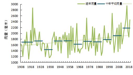 图2 广州1908-2019年逐年雨量(单位:毫米)