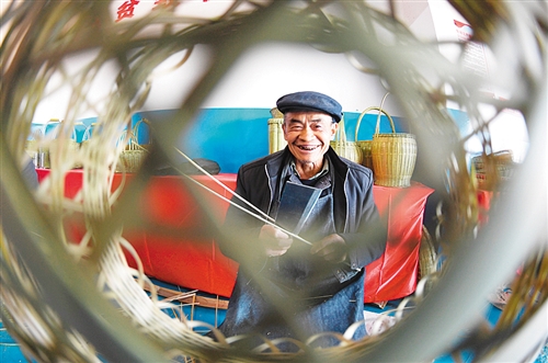 ?会泽县易地扶贫搬迁安置点扶贫车间,搬迁户袁国才在编织竹篮。