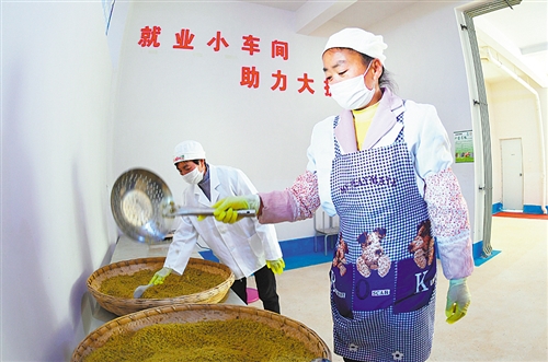 ?会泽县易地扶贫搬迁安置点就业小车间,搬迁群众金德英(右)在制作特色农产品。会泽规划实施了产业扶贫项目265个。