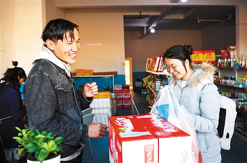 ?会泽县易地扶贫搬迁安置点,贫困户李世祥(左)开了家扶贫超市。会泽县大力组织劳动力转移就业,努力实现“人人有事做,个个有收入”。