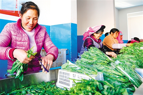 ?会泽县易地扶贫搬迁县城安置点扶贫工厂,村民余忠仙(左一)在打包蔬菜。搬迁后,她在家门口实现了就业。