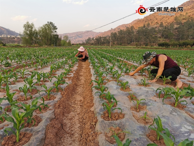 禄丰县妥安乡积极调整农业产业结构,种植的500多亩青早玉米目前已破膜出苗,长势喜人。图为农户正在间苗。 (通讯员李平波/摄)