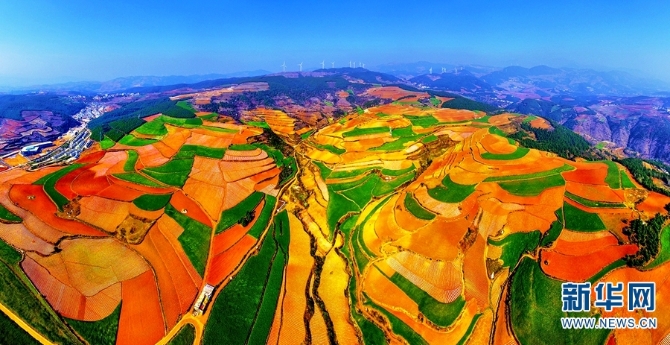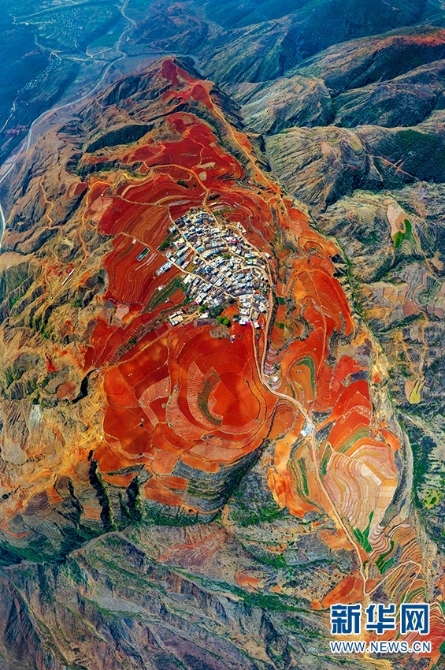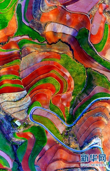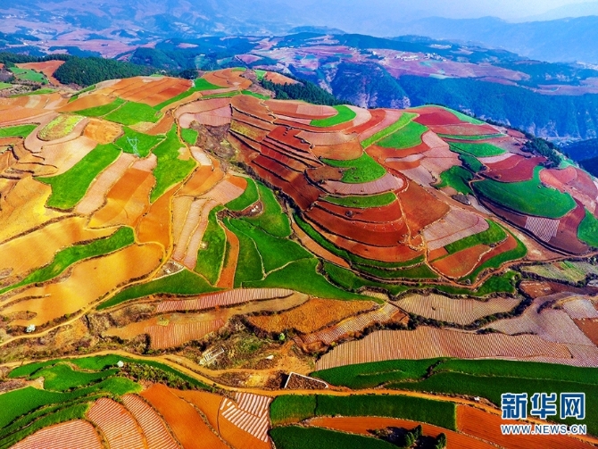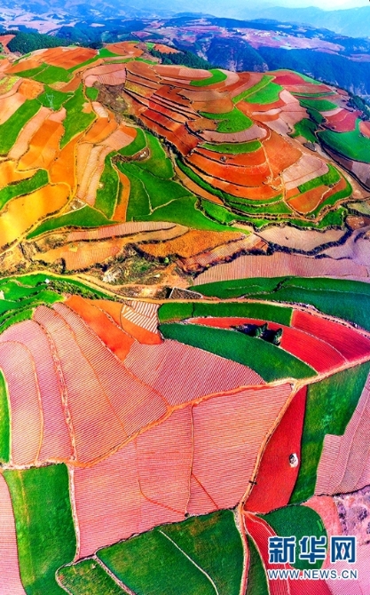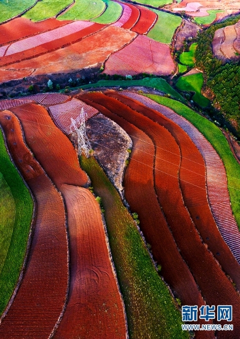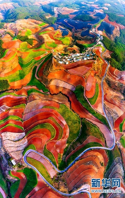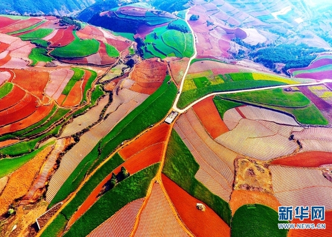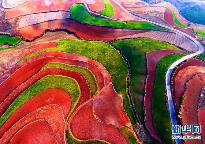 东川红土地景区,位于云南省昆明市东川区红土地镇,独特的红色土壤成片地覆盖在蜿蜒起伏的山地上,与绿色的庄稼、银灰色的道路、白色的村庄等交相错杂,形成了一幅幅色彩斑斓、绚丽多姿的巨幅“油画”。(新华网 崔永江/摄 念新洪/文)