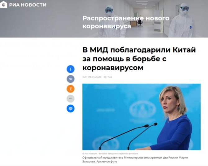 针对中国政府近日就俄罗斯抗击疫情提供援助物资一事,俄外交部发言人扎哈罗娃在当地时间2日举行的记者会上向中方表示感谢。此外,据俄新社介绍,扎哈罗娃当天还以俄中两国互相援助为例,提到不久前收到俄方救援物资的美国并表示,相信后者在必要情况下也会向俄方提供帮助。