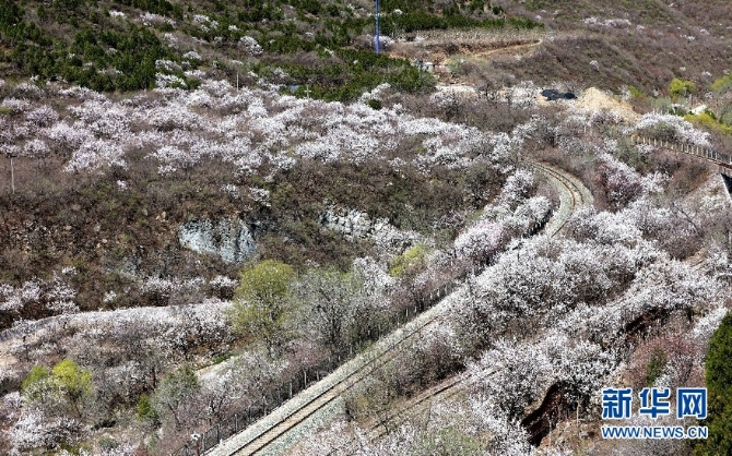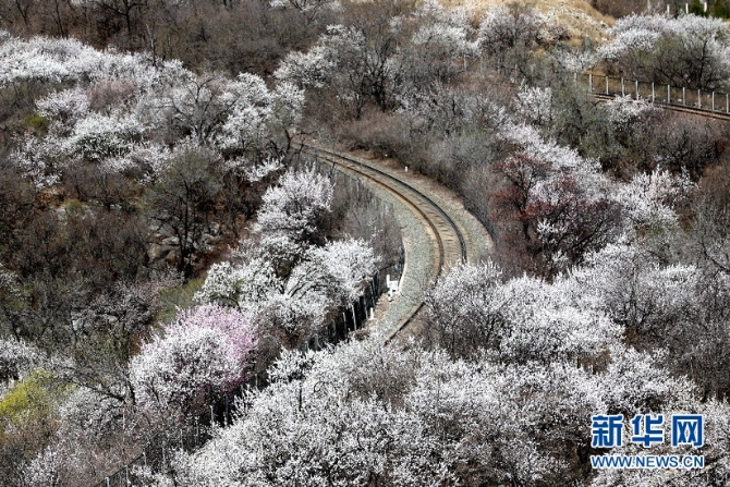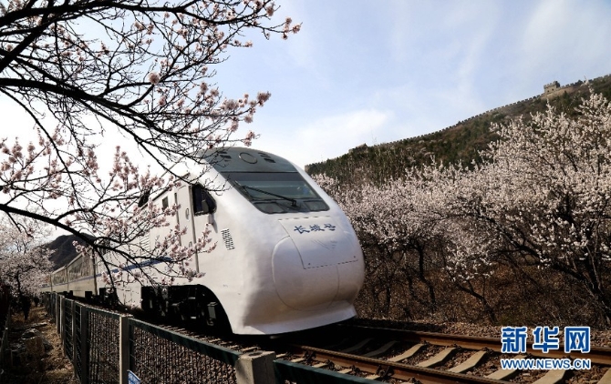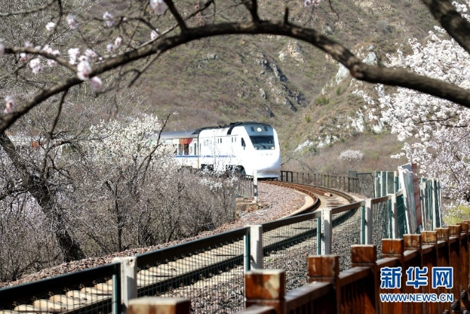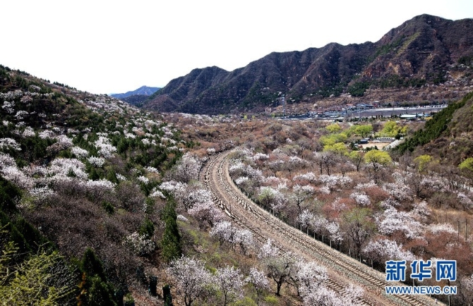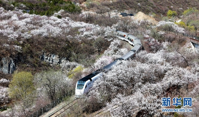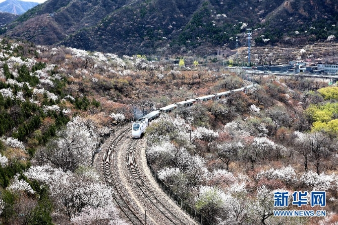 阳春三月,山花烂漫。作为“燕京八景”之一的“居庸叠翠”景观壮美,置身其中令人心醉。春风徐来,杏花满枝,随风而动漫天花海,列车过处恍若仙境。
