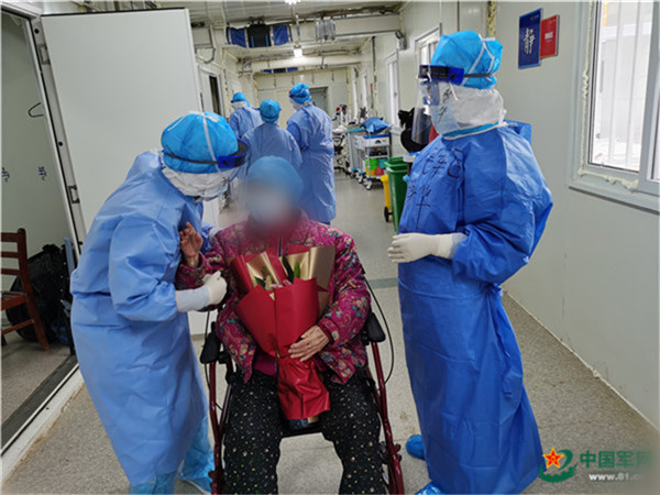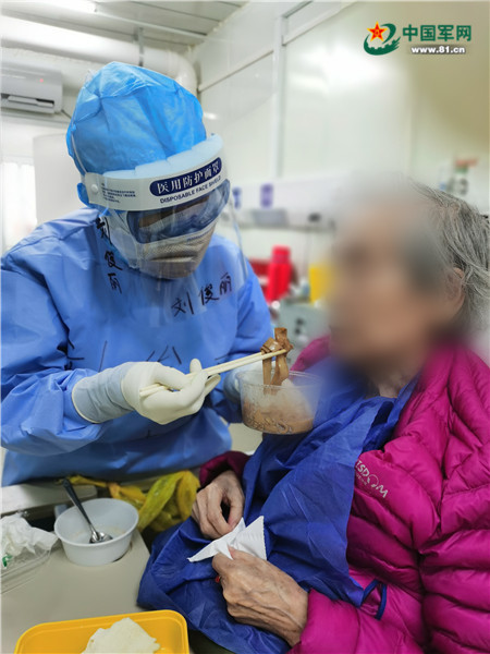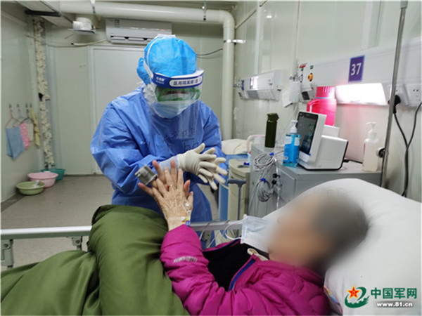 3月11日,丁奶奶因新冠肺炎转院到火神山医院治疗。刚入院时,奶奶身体消瘦、精神萎靡、反复咳嗽,蜷缩在床上虚弱的样子让医务人员很揪心。针对奶奶年龄大、做过心脏手术、基础疾病多的实际情况,病区组成专家团队提供了科学细致服务。治疗上,主管医生谢华采取氧疗、干扰素雾化、祛痰等个体化治疗方案;护理上,考虑到奶奶生活不能自理,安排专人给她擦洗身体、穿衣喂饭,照料生活起居。