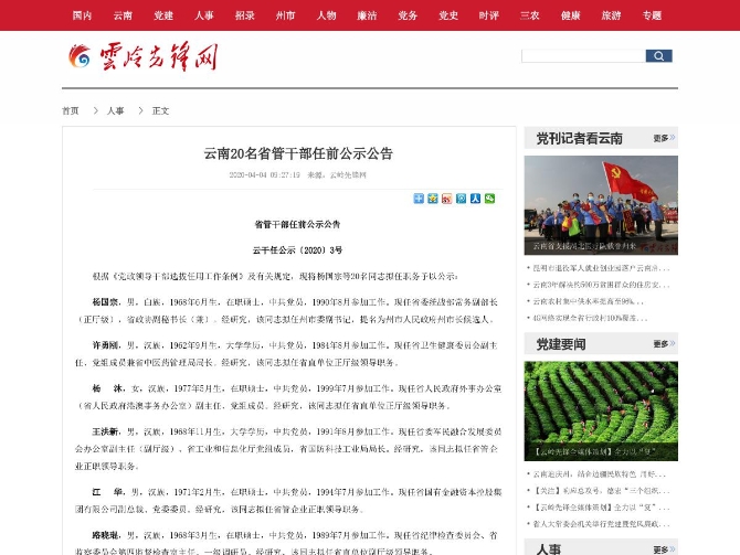 公示时间从2020年4月4日起至2020年4月13日止(国家法定节假日除外),如对被公示人员有意见,可通过来信、来电、来访等方式,向中共云南省委组织部干部监督处反映。反映问题要实事求是,客观公正,提倡签署真实姓名并告知联系方式。我们将严格遵守工作纪律,履行保密义务。通讯地址:云南省昆明市广福路8号省委组织部干部监督处,邮编:650228,举报电话:0871—12380。