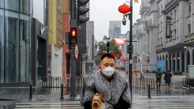 “封城”后,空旷的武汉江汉路步行街上,一位市民佩戴口罩带着宠物狗出行。中新社记者 张畅/摄