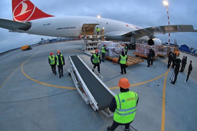 4月1日,在白俄罗斯首都明斯克国际机场,工作人员从飞机上卸下中国政府援助的人道主义抗疫物资。(新华社发 任科夫摄)