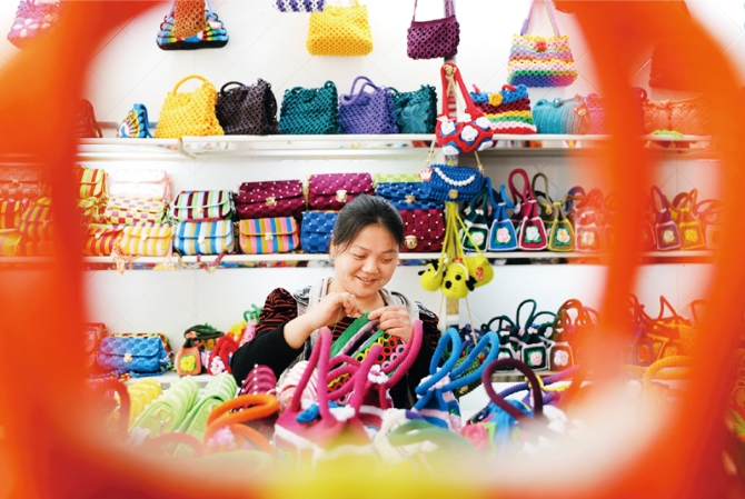 增加就业是最有效最直接的脱贫方式。在做好疫情防控的前提下,要有序推进易地扶贫搬迁安置点的“扶贫车间”复工复产,促进搬迁群众在家门口实现就业增收,不断巩固脱贫攻坚成果。图为2020年3月21日,在贵州省赤水市长期镇康桥社区,一名妇女在安置点的“扶贫车间”内钩织产品。 人民图片 王长育/摄