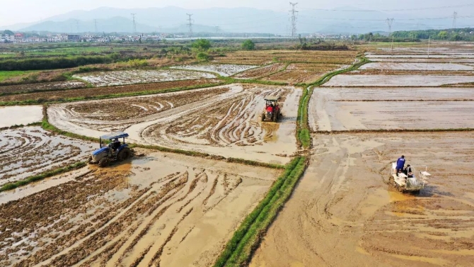 4月4日,南昌市新建区石埠镇农民在田里翻耕播种(无人机照片)。清明时节,江西省南昌市新建区各乡镇农民抢抓晴好天气,翻耕、播撒早稻种,加速进行春播工作。新华社记者 彭昭之 摄