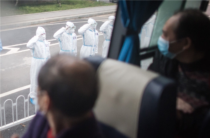 3月12日,在湖北武汉,公安民警向踏上回家路的治愈患者敬礼。新华社记者 肖艺九 摄