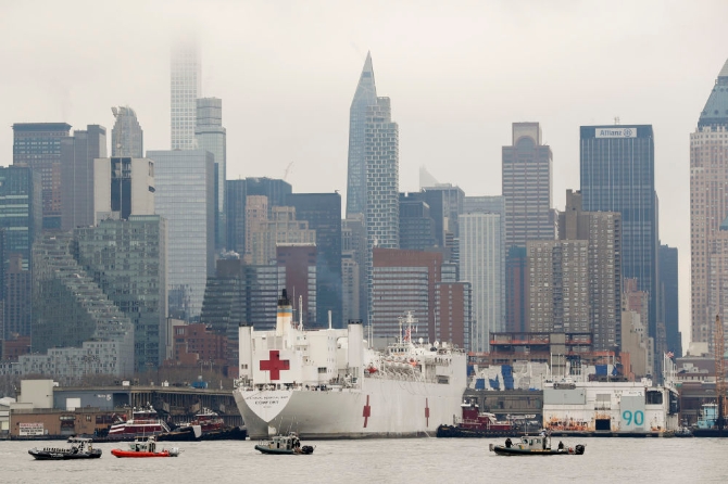 3月30日,在美国纽约,美国海军医院船“舒适”号停泊在一处码头。新华社发(广羽摄)