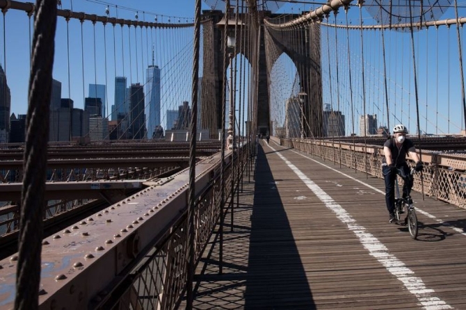 3月27日,一名戴口罩的男子骑车经过美国纽约布鲁克林大桥的栈道。新华社发(郭克摄)