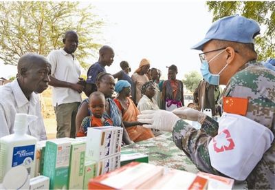 日前,中国第六批赴南苏丹(朱巴)维和步兵营医护人员为驻地民众进行卫生防病和疫情防控宣讲。图为医护人员在附近的皇后村开设临时巡诊点、发放常用药品。