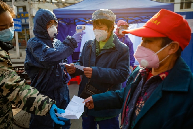 2月22日,在武汉市百步亭社区建设新村,社区工作人员(左一、左二)在出入口查看居民进出凭证,并为居民测量体温。新华社记者 沈伯韩 摄