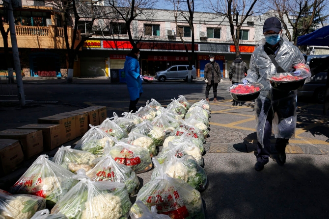 2月20日,湖北省武汉市下沉花桥社区的干部在搬运居民订购的草莓。新华社记者 沈伯韩 摄