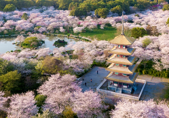 3月20日拍摄的武汉东湖樱园(无人机照片)。新华社记者 熊琦 摄