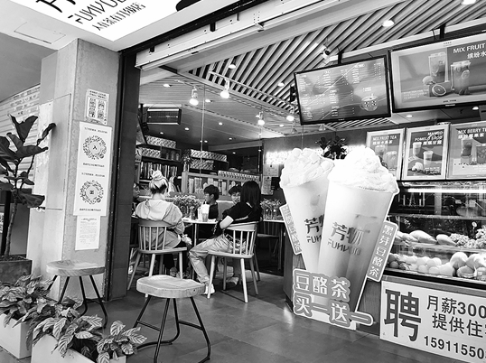 记者来到金鹰广场发现,星巴克、奈雪的茶两家店里外都坐满了消费者。