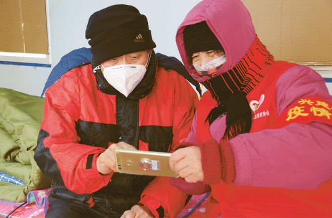 今年70岁的于庆河和69岁的黄玉芹是住在黑龙江哈尔滨平房区兴建街道上海新村社区的一对夫妻,两人都是有多年党龄的老党员。面对疫情,夫妻二人“人老心不老”,第一时间报名加入志愿者团队,积极参加社区疫情防控值勤工作。图为2020年3月3日,于庆河(左)、黄玉芹在闲暇时通过手机与儿子、儿媳互报平安。 新华社记者 强勇/摄