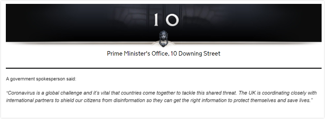 英国政府发言人:新冠肺炎病毒是全球性挑战,各国齐心协力应对这一共同威胁至关重要。英国政府正与国际各国紧密合作,保护公民免受虚假信息的侵害,使人们获得真实的信息来保护自己,挽救生命。