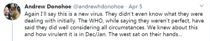 @英国网友:这是一种新病毒,中国开始也不知道到底是什么。世卫组织说这虽这并非完美,但中国的确考虑到各种可能发生的情况。我们在12月/1月就知道这个病毒了,但我们西方却什么都没有做。