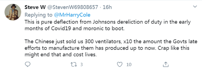 @英国网友:英国政府在转移疫情爆发初期的失职和反应迟钝。我们刚从中国买了300台呼吸机,这是政府后来生产数量的10倍。这样的废话需要停止了,这会令生命付出代价的。
