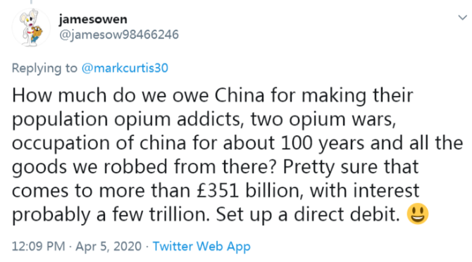 @网友:英国欠中国多少钱?我们让他们对鸦片上瘾,发动两次鸦片战争,占领中国一百年,还有我们从中国抢走的所有东西?可以肯定的是,这一定超过3510亿英镑,利息可能达到几万亿英镑,应该设置银行自动付款。