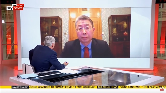 △4月6日,中国驻英国使馆马辉公使在接受英国天空新闻台“新闻时间”节目直播连线采访