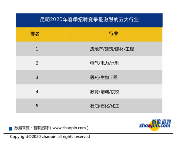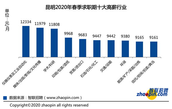 4月8日,智联招聘发布《2020年春季昆明雇主需求与白领人才供给报告》,全国38个监测城市中,昆明地区竞争指数30.4,排名第22位,上升7位。春季平均薪酬为7744元/月,排名第28位,其中,仪器仪表及工业自动化行业的平均月薪最高,为12334元/月。