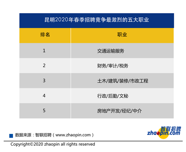 智联招聘在线数据显示,昆明地区2020年春季竞争最激烈的职业是交通运输服务、财务/审计/税务和土木/建筑/装修/市政工程。行政/后勤/文秘和房地产开发/经纪/中介的竞争也较为激烈。