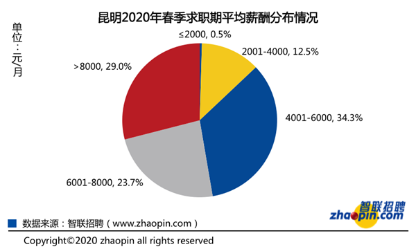 从薪酬的分布情况来看,昆明地区薪酬水平中等,平均月薪4001元/月至6000元/月的职位占职位总量的34.3%,8000元以上/月的占29.0%,占比较上一季度有所下降。