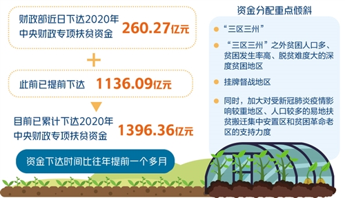 如期高质量打赢脱贫攻坚战,资金保障十分重要。近日,财政部下达各地2020年中央财政专项扶贫资金260.27亿元,加上提前下达的资金,目前已累计下达2020年中央财政专项扶贫资金1396.36亿元,下达时间比往年提前一个多月。